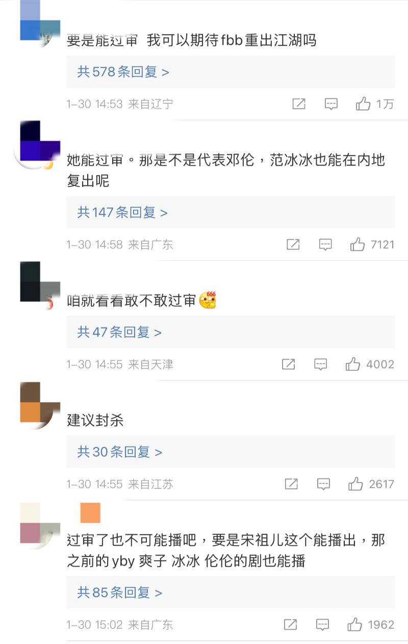 在傳出宋祖兒將回歸之後,網友評價普遍認為,如果宋祖兒能回歸,那麼之前因為稅務問題被封殺的范冰冰、鄧倫、袁冰妍等人也理該解封👇