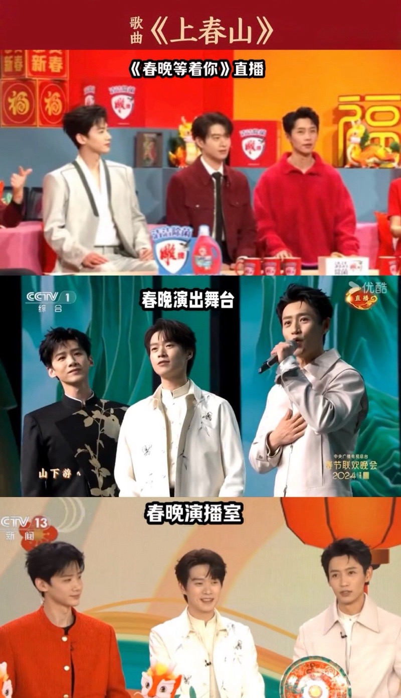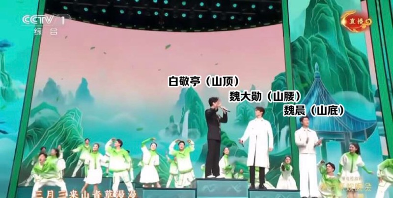 沒錯,在年除夕播出的春晚,白敬亭、魏大勳和魏晨一起在央視春晚演唱了一首歌曲《上春山》,先來看看官方節目圖。