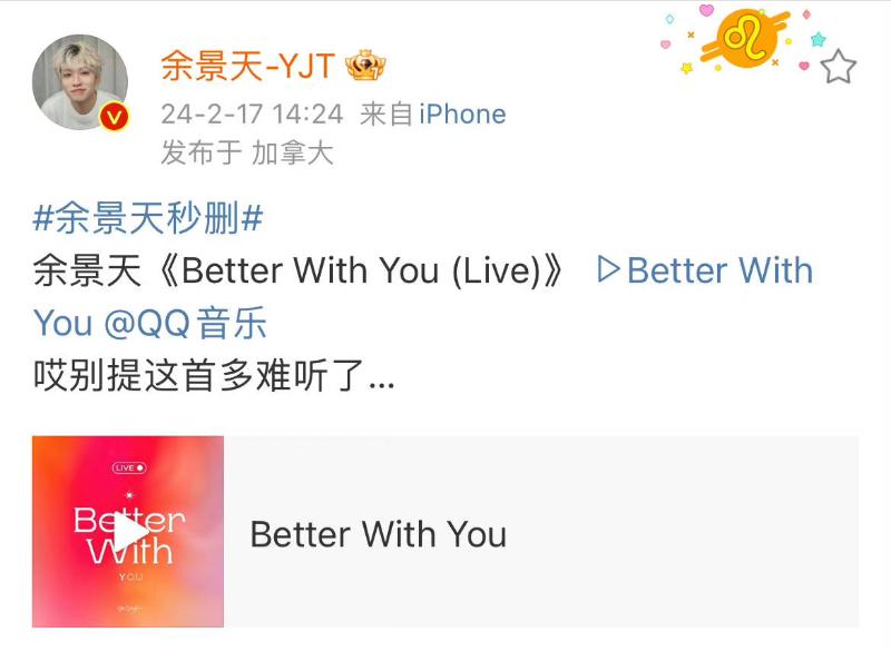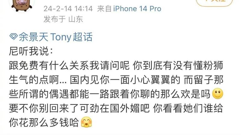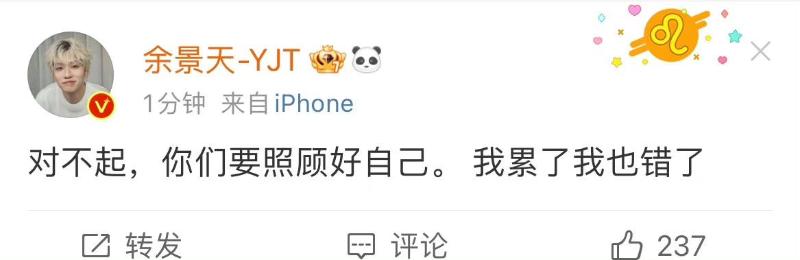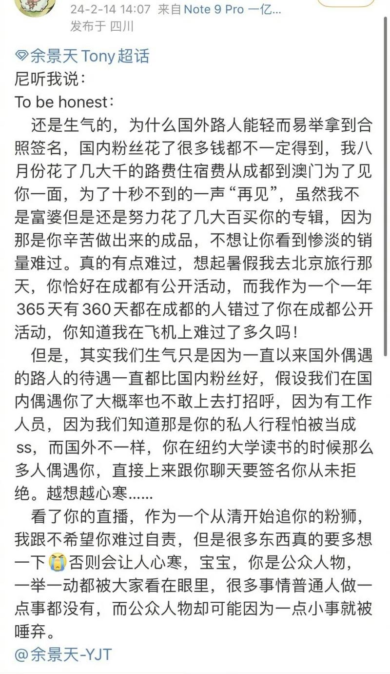 這段經歷公開之後,中國國內大批粉絲破防,認為自己花了這麼多錢支持,得到的回應還不及偶遇的路人來得多!因此,余景天的微博被解讀成…認錯了。