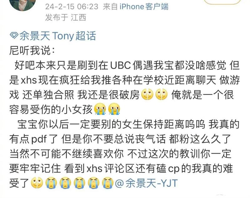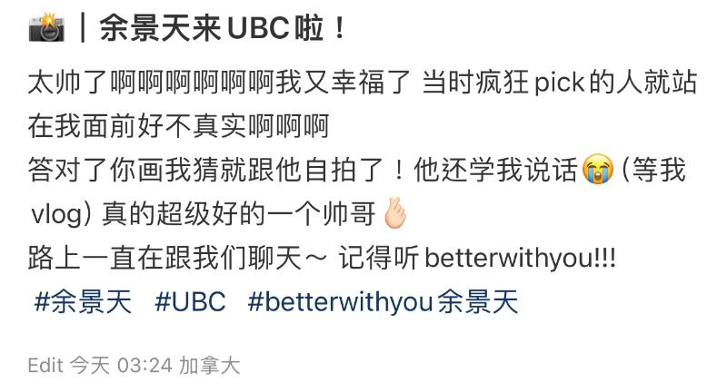 余景天這舉動被解讀成安撫吃醋的粉絲,到底怎麼一回事呢?原來有在加拿大的女粉絲,發文分享了自己在不列顛哥倫比亞大學偶遇余景天的經歷👇