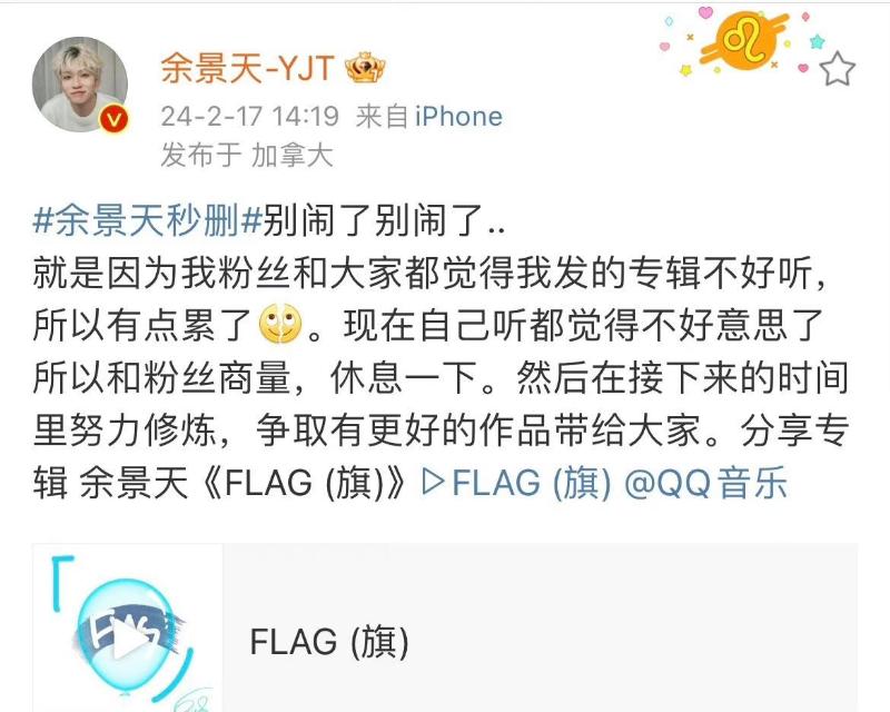 而在17號這天,余景天突然發文表示:「對不起,你們要照顧好自己,我累了我也錯了。」但隨即秒刪👇