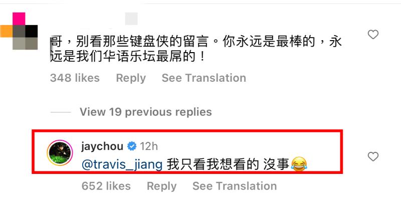 雖然但是,對於這麼多爭議,周杰倫在INS特別回應了一位粉絲的留言,表示「我只看我想看的,沒事」👇