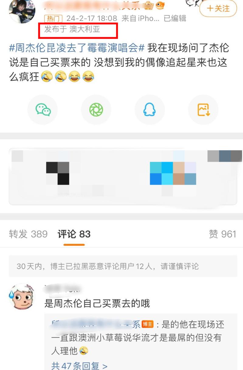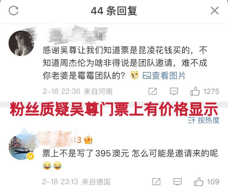 雖然但是,周杰倫這兩篇動態,卻引起了中國霉霉粉絲的不滿~他們認為周杰倫是在吹牛,明明坐的不是霉霉親友區,卻要吹牛是被邀請的。來看看霉霉粉絲曬出的證據~首先,有IP在澳洲的網友發文,表示自己在現場問了周杰倫,對方表示是自己買票來的👇