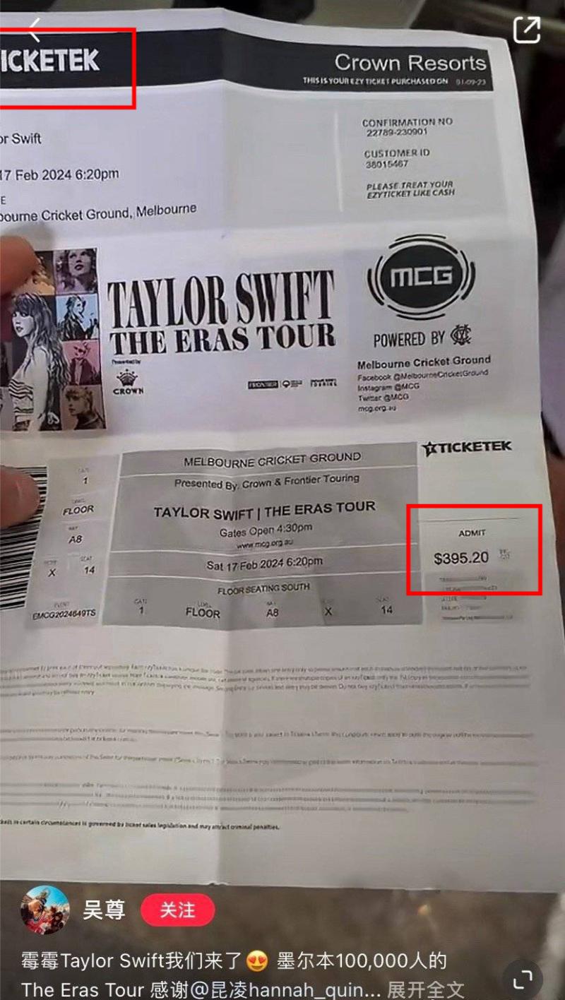 而在吳尊曬出的vlog中,Taylor Swift粉絲發現吳尊曬出的門票,印有票價,而且也是通過正常驗票管道進場👇