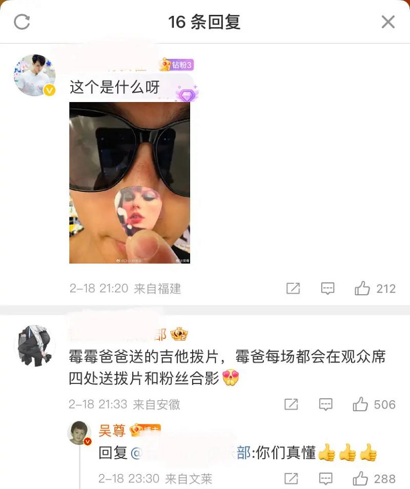 而在吳尊評論區,也有網友詢問他曬出的是什麼?有粉絲回應表示這是印有霉霉肖像的吉他撥片,她爸每場巡演都會在觀眾席送撥片和粉絲合影,吳尊還翻牌回應:「你們真懂!」這也打臉了周杰倫粉絲表示「昆凌和霉爸合照」是在親友團的最佳證明👇