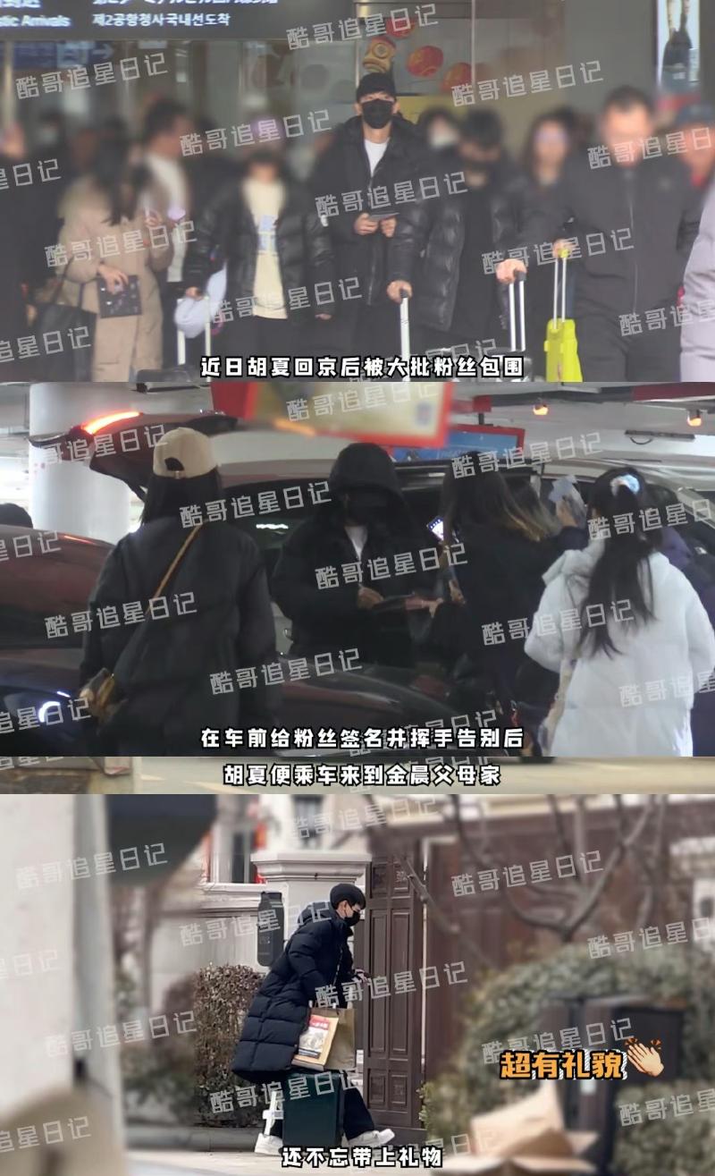 在19號這天,又有媒體公開了過年期間,胡夏到金晨家拜訪其父母的報導!狗仔表示胡夏帶著禮物到金晨父母家拜訪👇