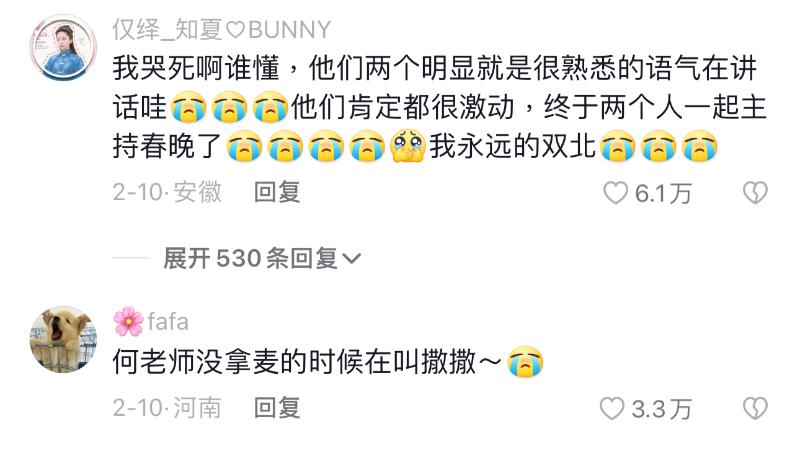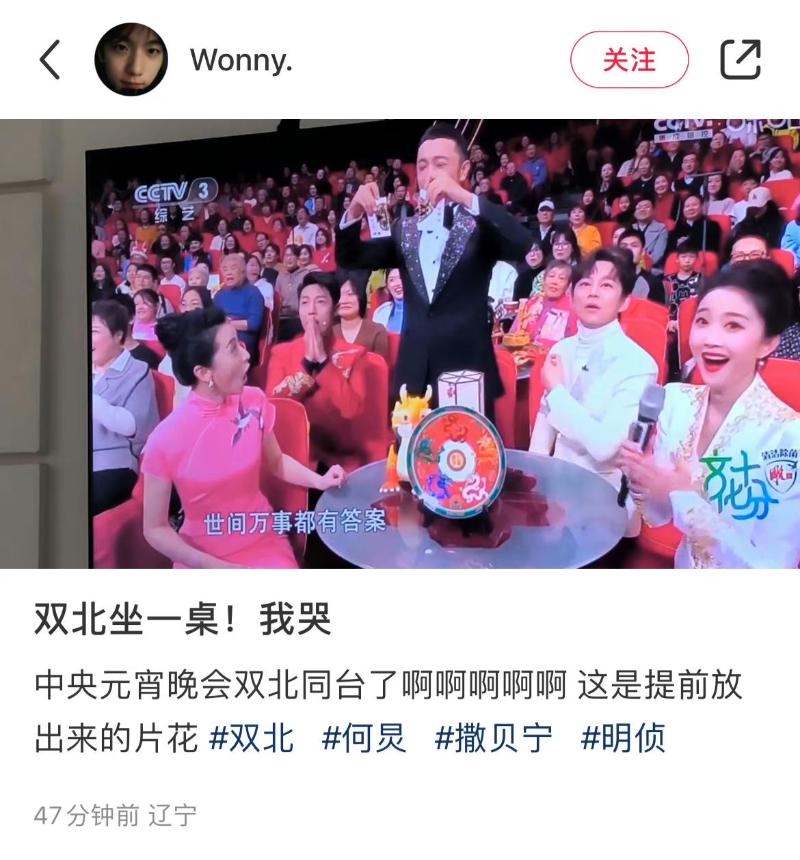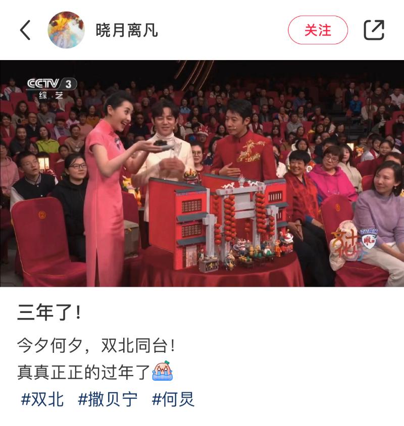 結果踏入龍年,雙北就頻頻送上合體好消息!先是兩人一同主持了今年的春晚,只不過撒貝寧依然負責總台,而我們何老師則是負責長沙分場👇
