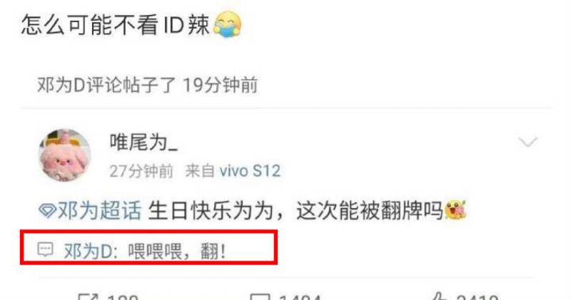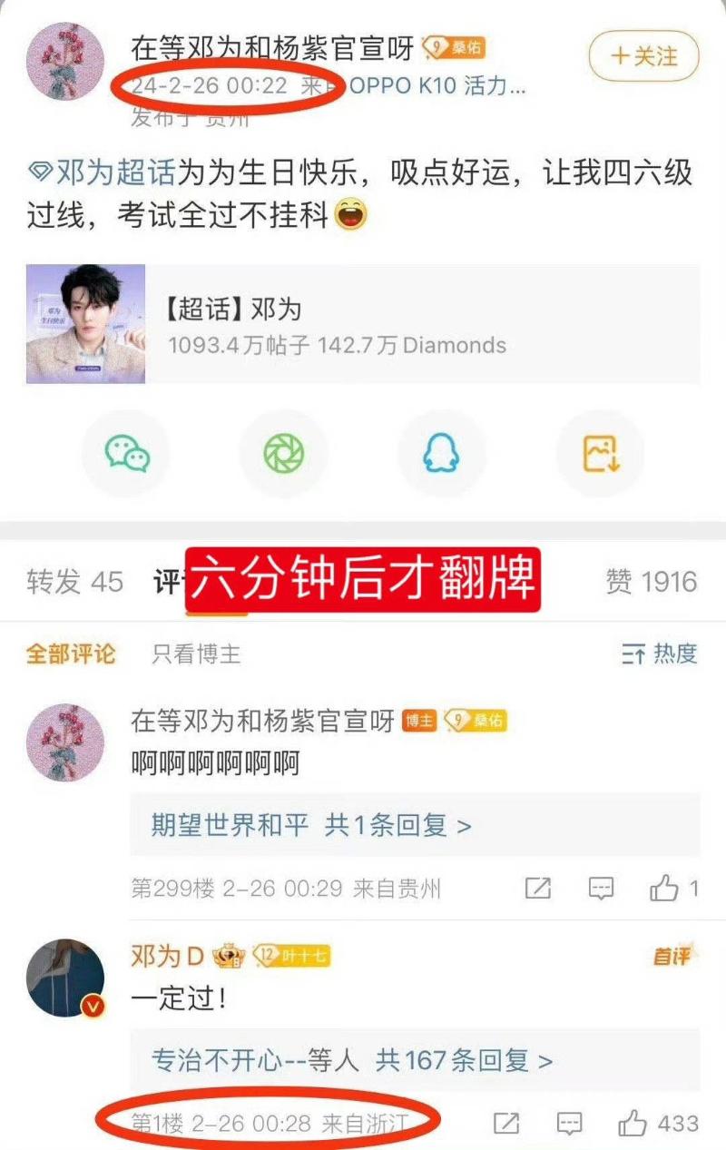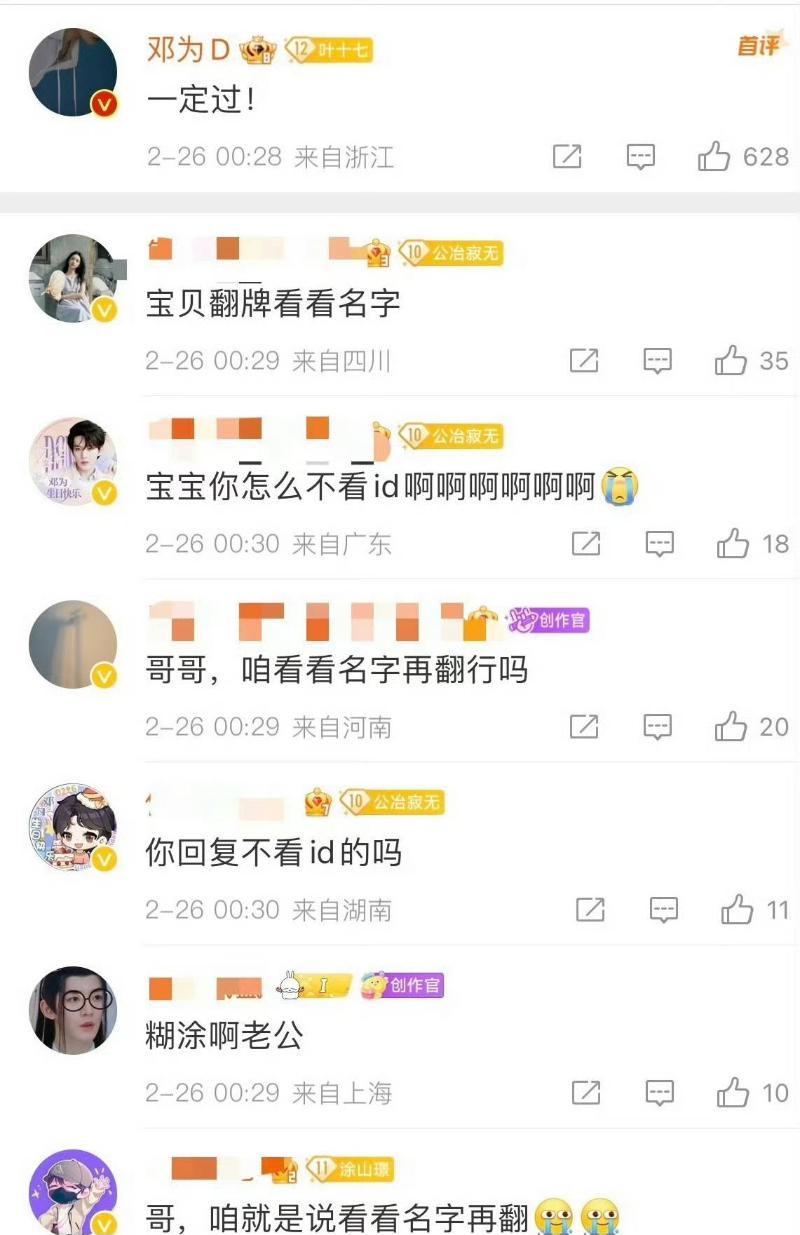 而且網友發現,這位CP粉的微博是10點22分發的,鄧為翻牌時間則是10點28分,說明不是即時刷到的,是鄧為仔細挑選的👇