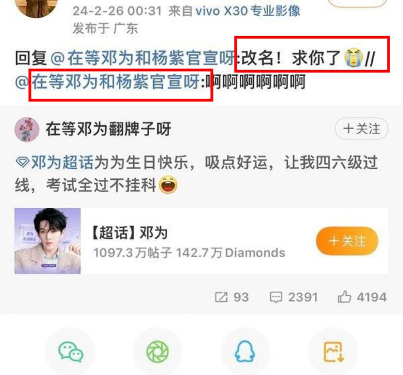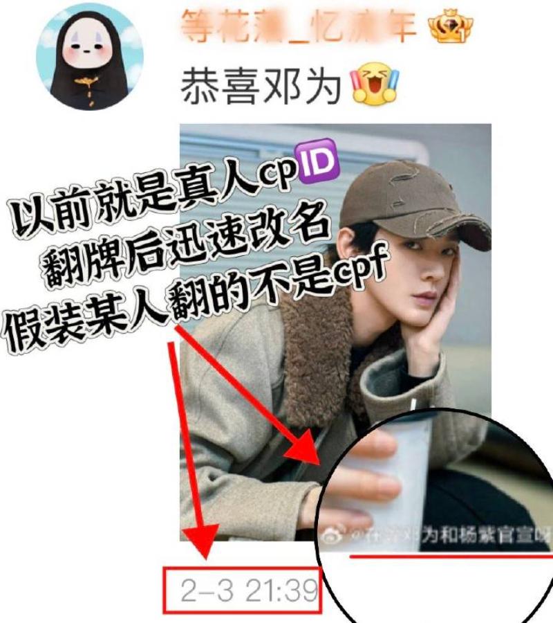 到底怎麼一回事呢?原來是鄧為翻牌了和楊紫的CP粉,重點,這位CP粉的ID就是「等鄧為和楊紫官宣」,粉籍十分明確👇