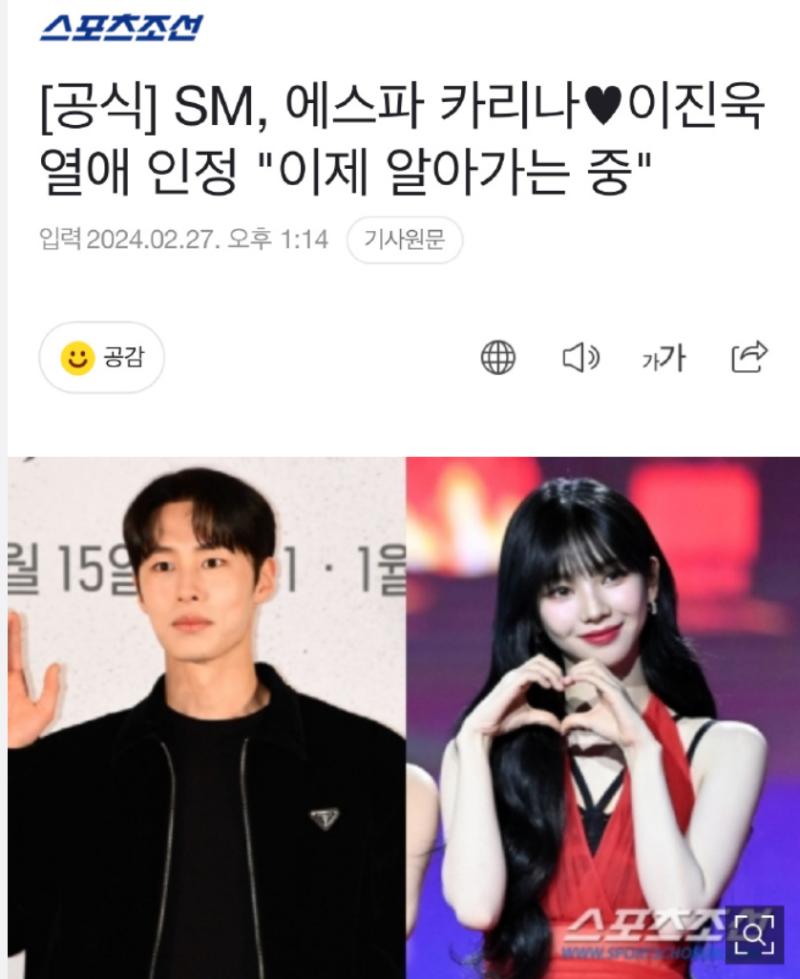 而媒體一直聯繫不上的Karina經紀公司SM娛樂,也發佈立場,承認了兩人正在戀愛。