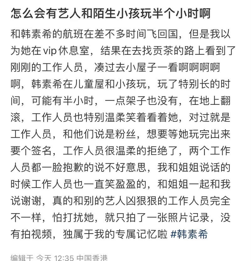 和韓素希的航班在差不多時間飛回國,但是我以為她在vip休息室,結果在去找貢茶的路上看到了剛剛的工作人員,湊過去小屋子一看啊啊啊啊啊,韓素希在兒童屋和小孩玩,玩了特別長的時間,可能有半小時,一點架子也沒有,在地上翻滾,工作人員也特別溫柔笑著看著她,對過就是工作人員,和他們說是粉絲,想要等她玩完出來要個簽名,工作人員很溫柔的拒絕了,兩個工作人員都一臉抱歉的說不好意思,我和姐姐說話的時候工作人員也一直笑盈盈的,和姐姐一起和我說謝謝,真的和別的藝人凶狠狠的工作人員完全不一樣,怕打擾她,就只拍了一張照片記錄,沒有拍視頻,獨屬於我的專屬記憶啦!」
