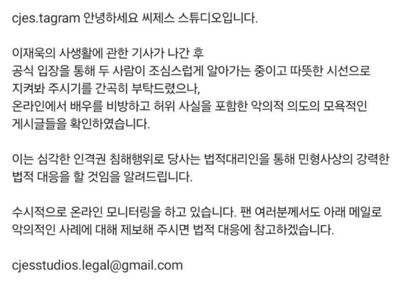關于李在旭私生活的報道出來後,通過正式立場,兩人正在小心翼翼地了解中,懇切地拜托大家用溫暖的視線關注他們,在網上確認了誹謗演員、包括虛假事實在內的惡意侮辱性帖子。這是嚴重的人格權侵害行為,我公司將通過法律代理人進行民事、刑事上的強有力的法律應對。我們隨時進行在線監控。如果粉絲們也通過以下郵件舉報惡意事例,我們會通過法律手段應對。」