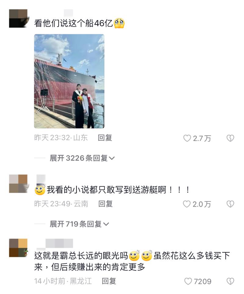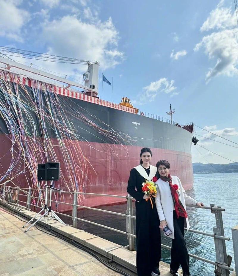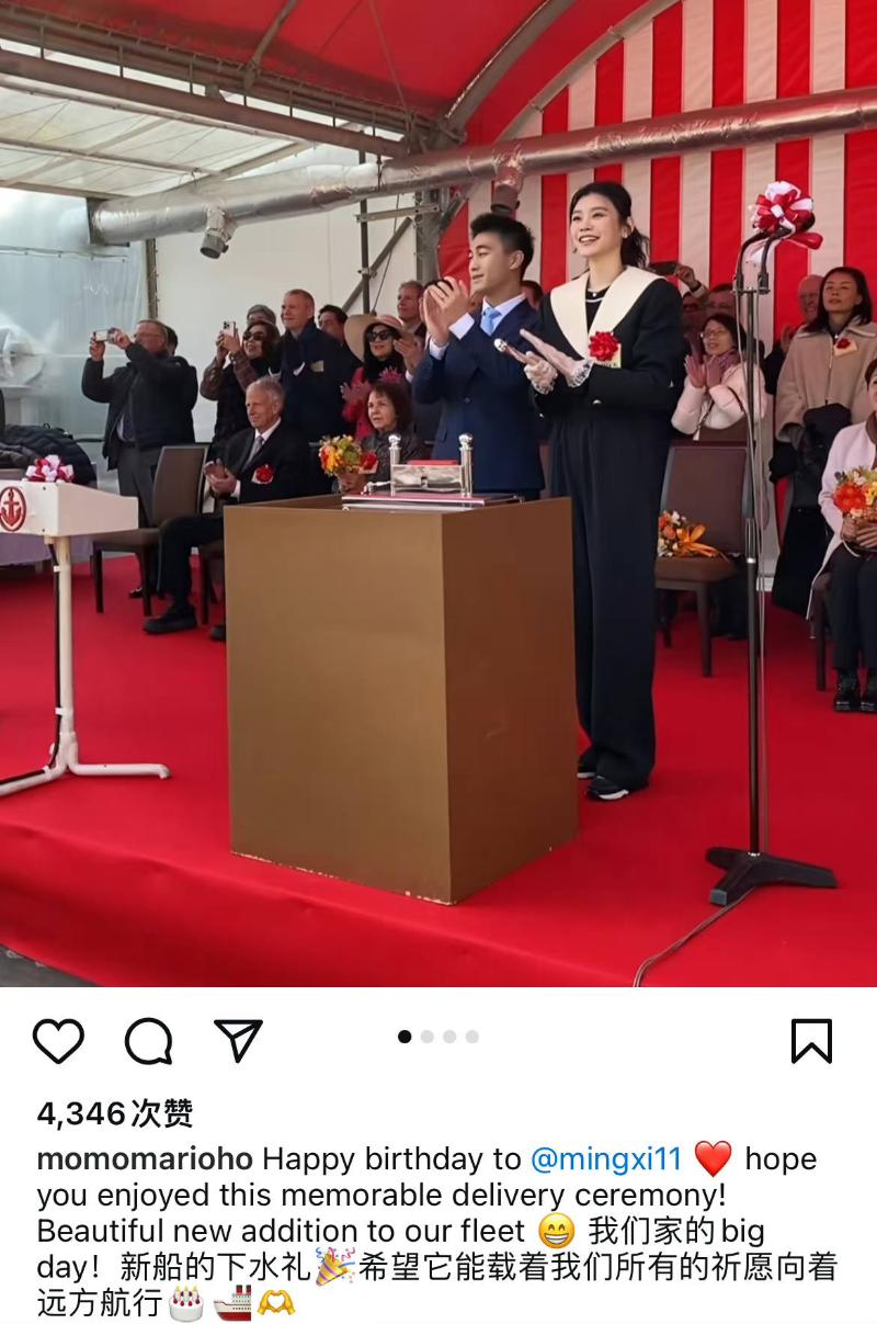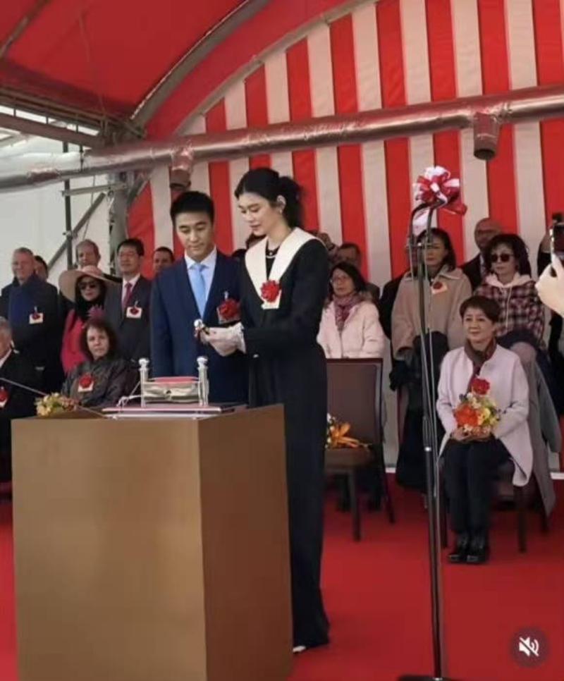 這裡科普一下,新船下水禮一般是指新船正式下水前,都要由一位重要人士(在中國一般為男士,而西方傳統一般由女士執行)將一瓶香槟擲在船首擊碎,稱為“擲瓶禮”。何家將價值46億的郵輪下船禮,交由了奚夢瑤負責,看得出她在婆家地位十分高,就連合影也站在C位。