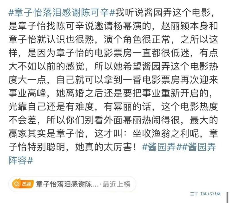 沒想到同晚,就有營銷號發文,表示章子怡的電影票房一直低迷,希望電影《醬園弄》熱度大點,但光靠她自己有難度,所以讓找來趙麗穎、楊冪就很熱鬧,章子怡作為一番,便可以坐收漁翁之利。
