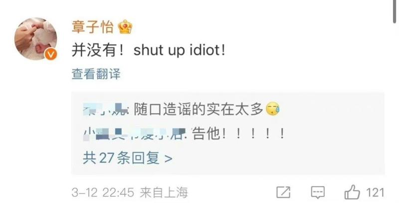 沒想到這番言論,直接讓章子怡空降評論區回應,否認了該營銷號的說法,並讓對方閉嘴:「並沒有!shut up idiot!」