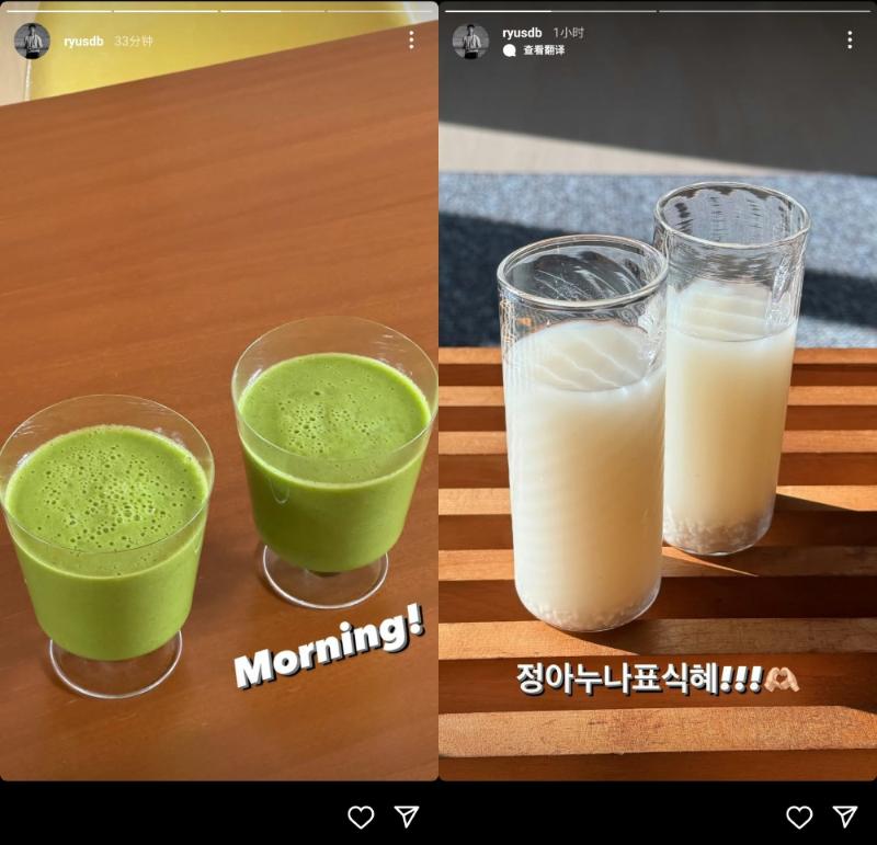 12月1日和2日,柳俊烈上傳了兩張限時動態,是兩杯果汁👇