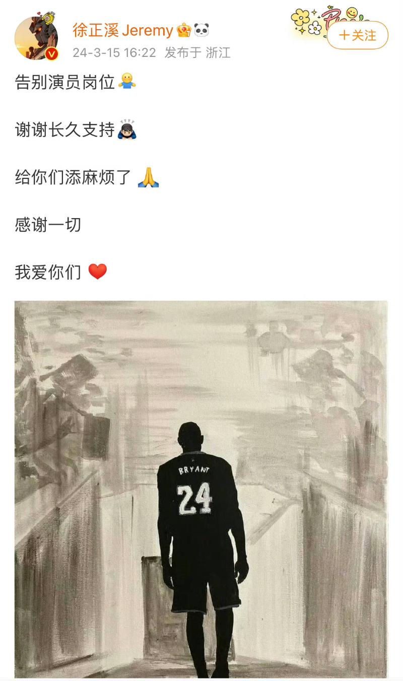 是噠,來看看,徐正溪發出的貼文,搭配了偶像科比官宣退圈時的插圖,表示「告別演員崗位,謝謝長久支持🙇🏻♂️給你們添麻煩了 🙏感謝一切,我愛你們」👇