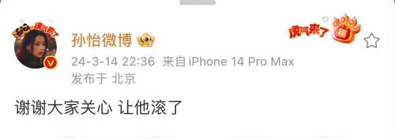 而沛沛時間線長文曝光之後,孫怡深夜發文,表示:「謝謝大家關心,讓他滾了!」
