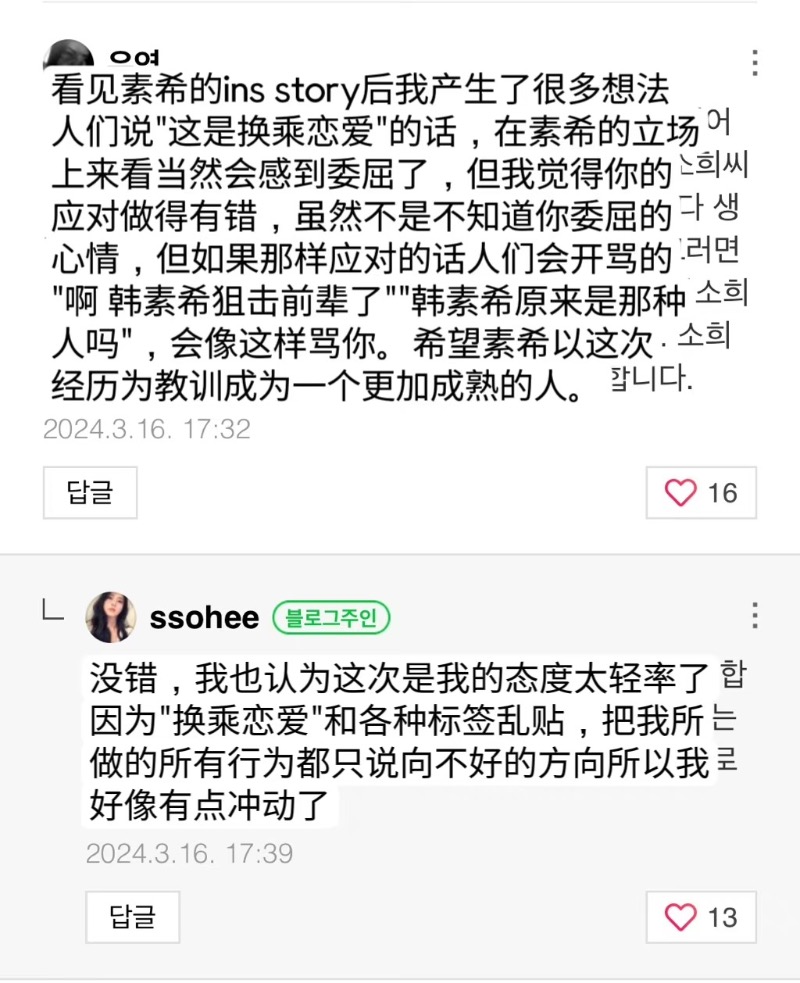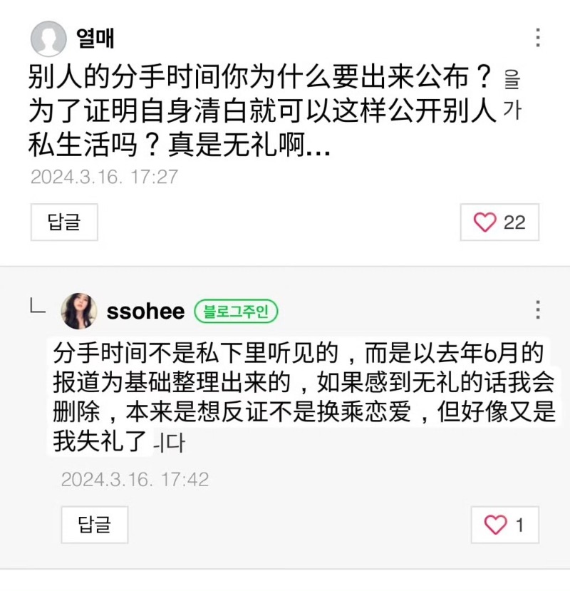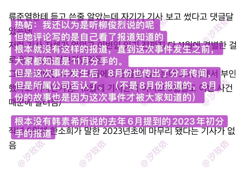 這些評論迅速在韓網迅速引起熱議,因為之前大眾一般認為韓素希是根據柳俊烈的說法,才會寫他和惠利23年1月份就分手,結果居然是她看新聞整理總結的😳問題是一直到去年11月爆出分手新聞以來,8月都還在否認,6月份也沒相關報導,哪來的新聞啊😧
