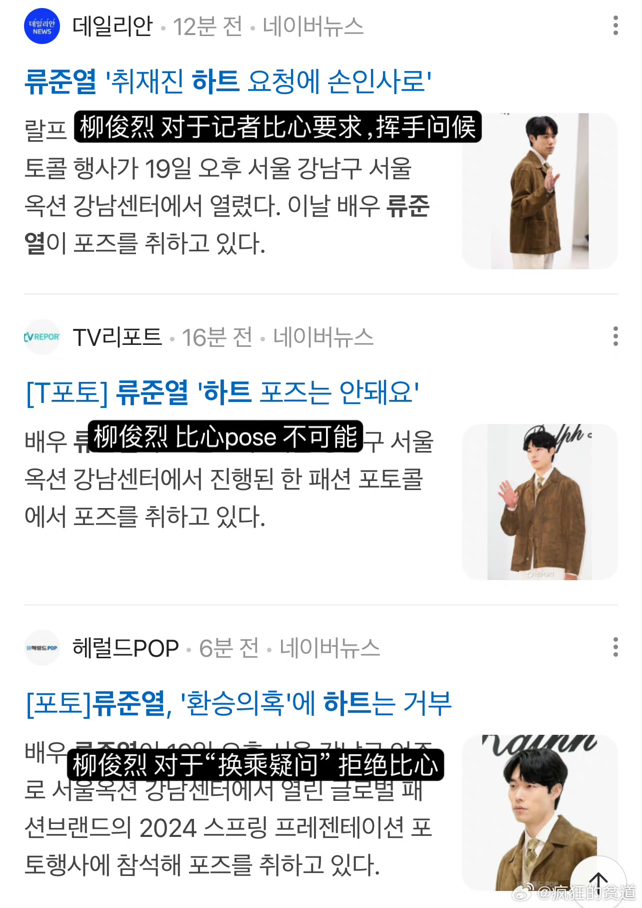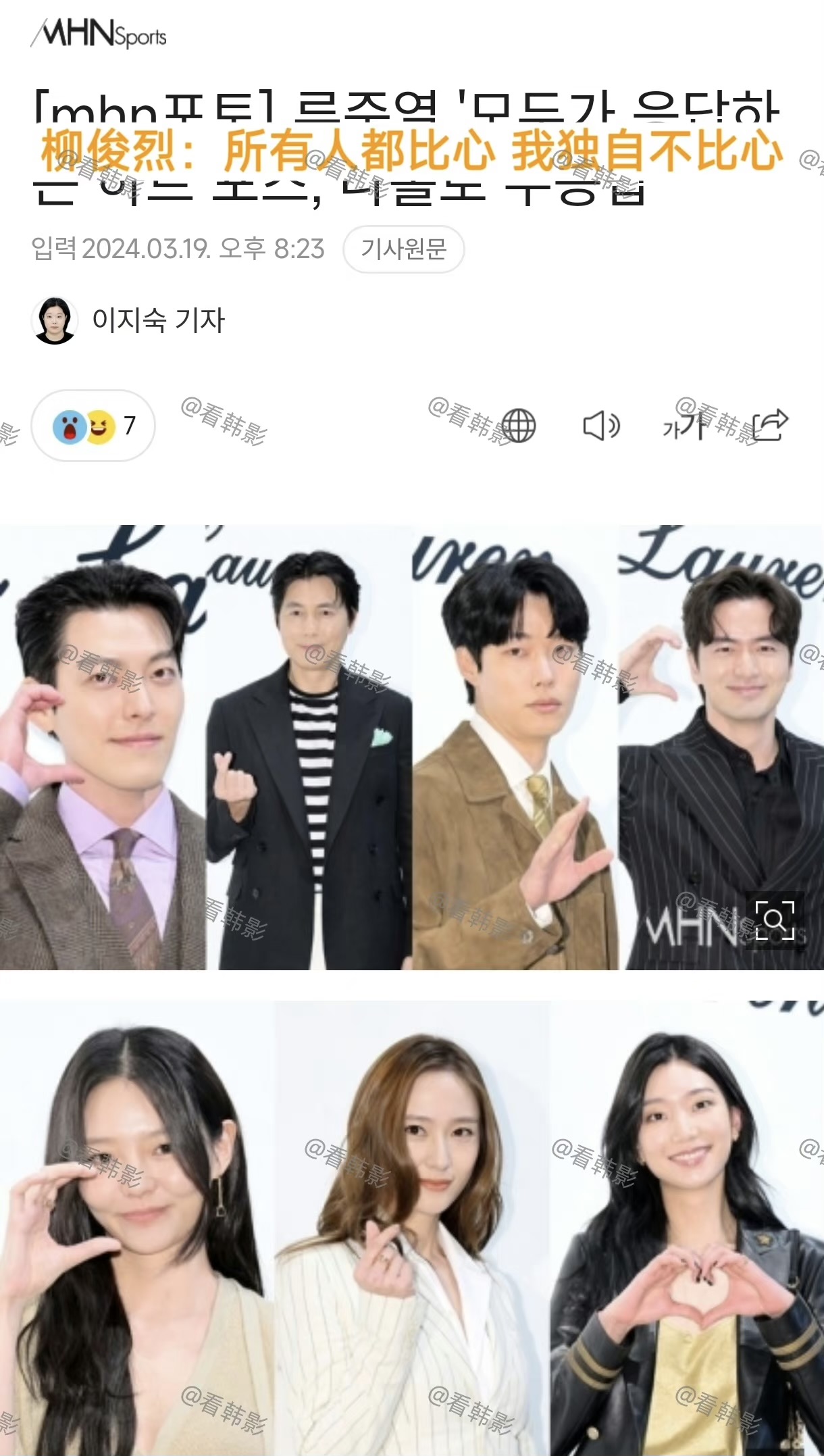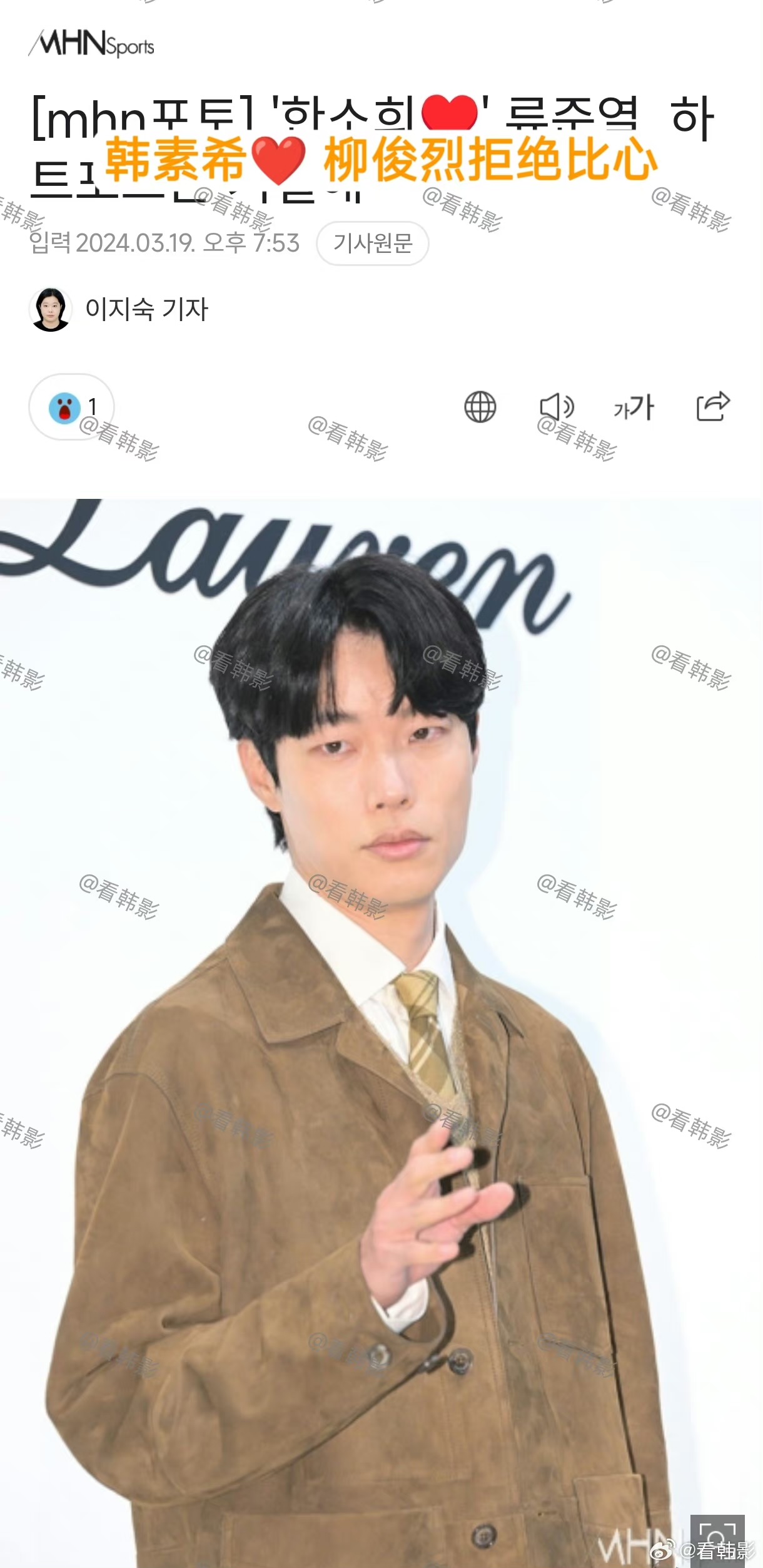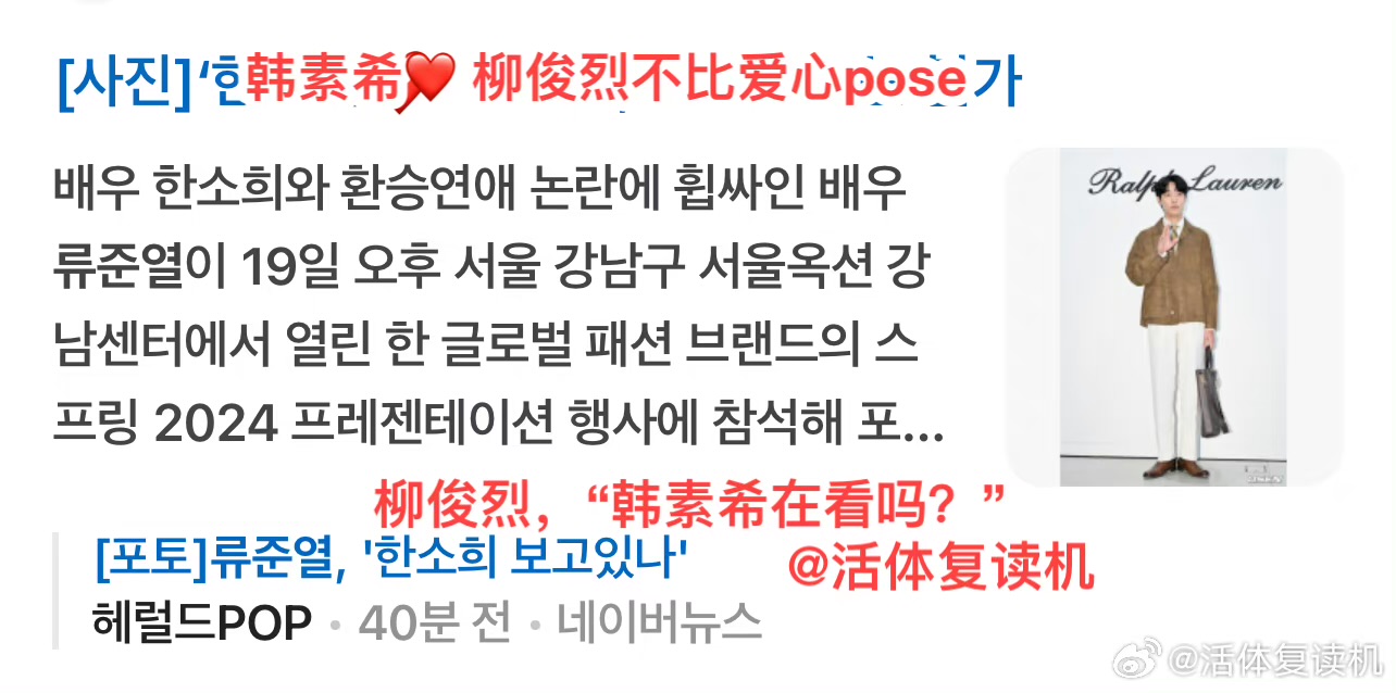 就是說,感覺在韓國如果拒絕比心,真的像是踩了韓媒底線,每個下標題都~超~狠~啊!是達,陷入戀情爭議,也是三位當事人中唯一沒有道歉的柳俊烈,在19號出席了時尚活動!
