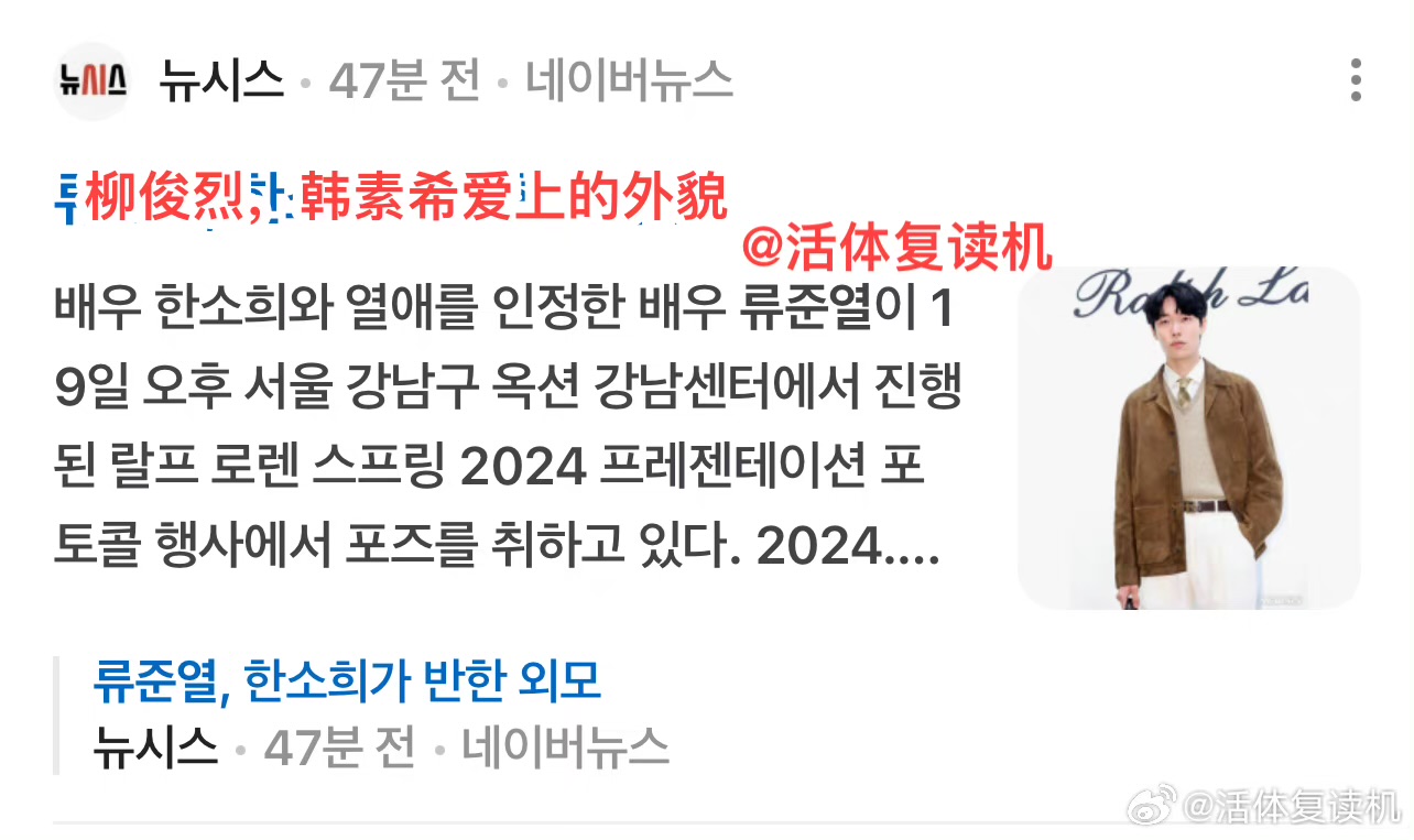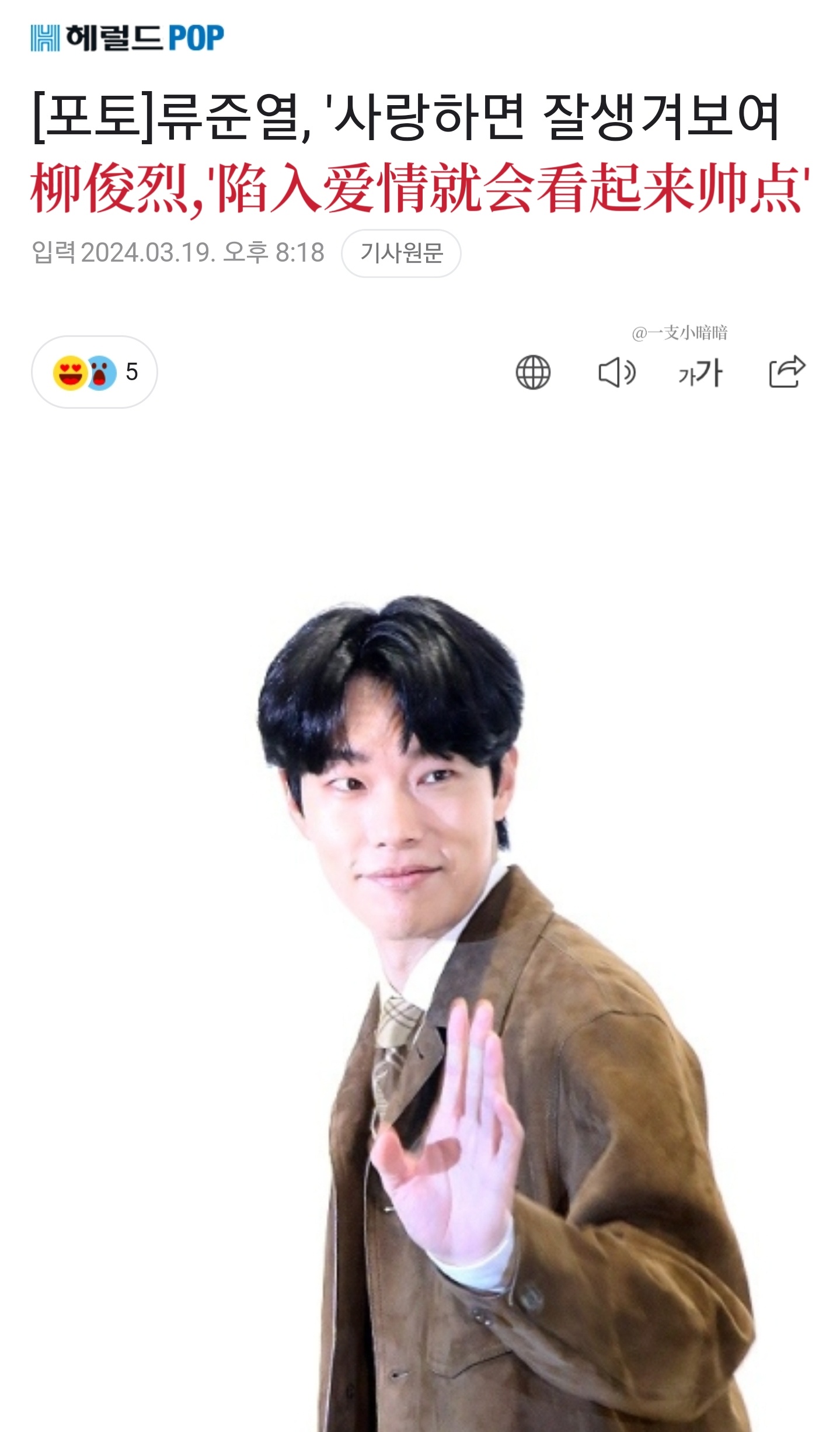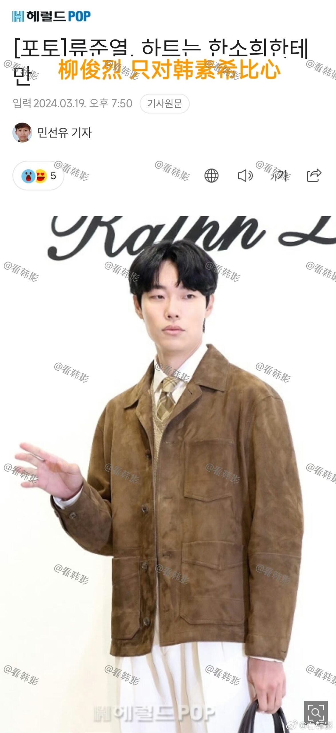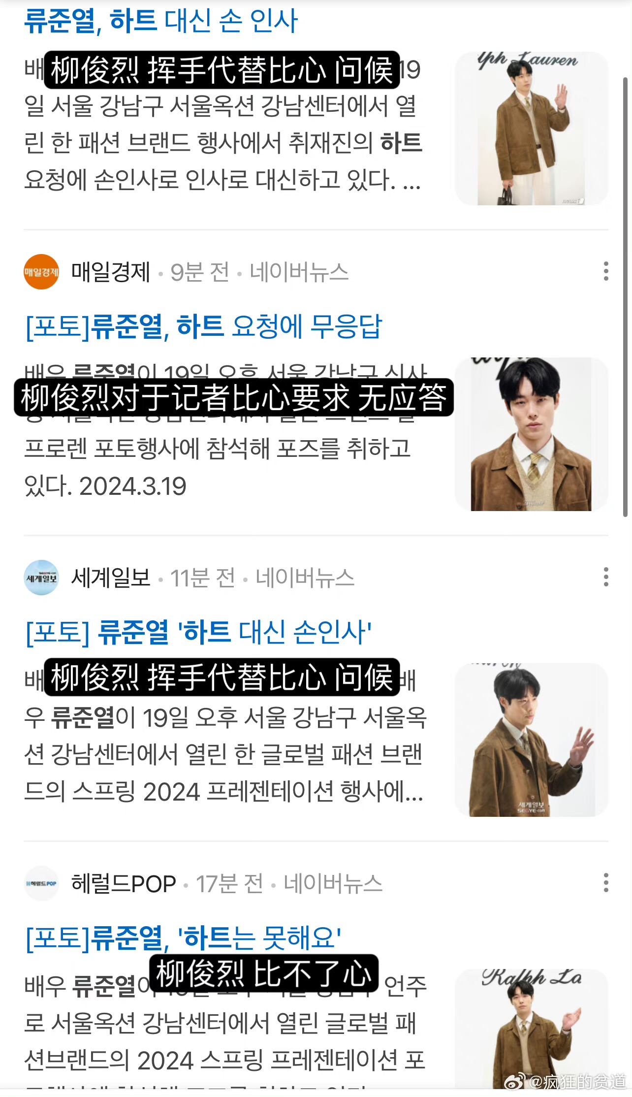 就是說,感覺在韓國如果拒絕比心,真的像是踩了韓媒底線,每個下標題都~超~狠~啊!是達,陷入戀情爭議,也是三位當事人中唯一沒有道歉的柳俊烈,在19號出席了時尚活動!