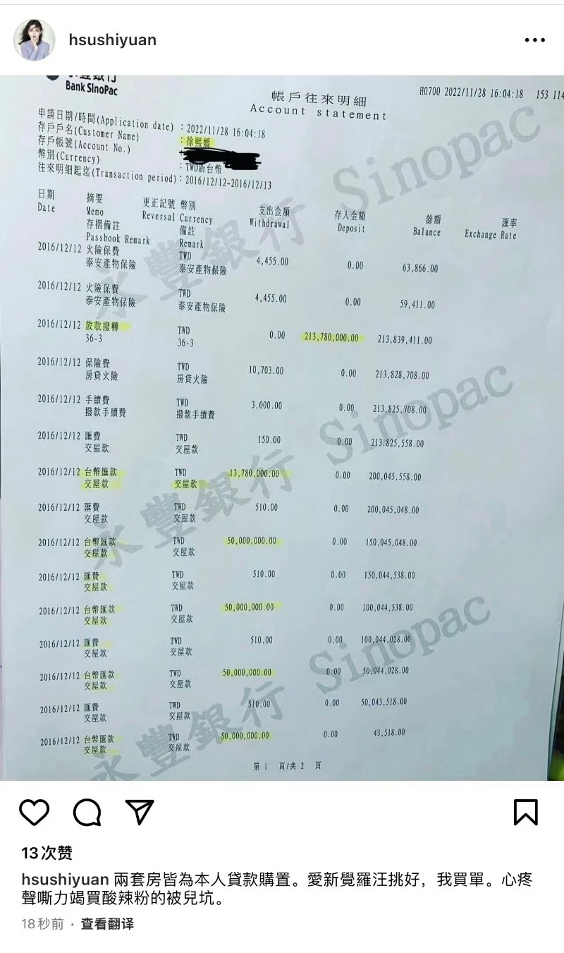 至於汪小菲過去總宣揚自己在台灣買了2套房,但錢其實都是由大S支付。大S當時也曾霸氣曬出房屋購置金額明細,汪小菲只負責挑房子,並開嗆「嫁入豪門真是穩賠,現在祖宗18代都被毀謗」