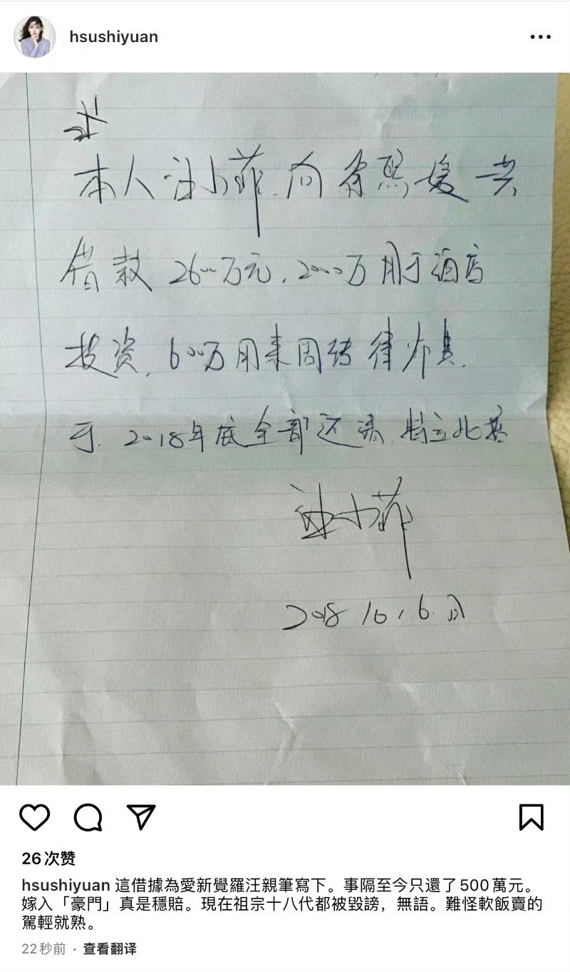 20號,大S母親接受台媒採訪,證實汪小菲欠大S上億元債務!據悉,大S曾曬汪小菲親筆借據,大S婚內借給汪小菲人民幣1,600萬元和港幣1,000萬元,附加等總高達新台幣1.7億元的欠債尚未償還,而這些都是大S工作多年所累積的資產,現在卻求償無門。