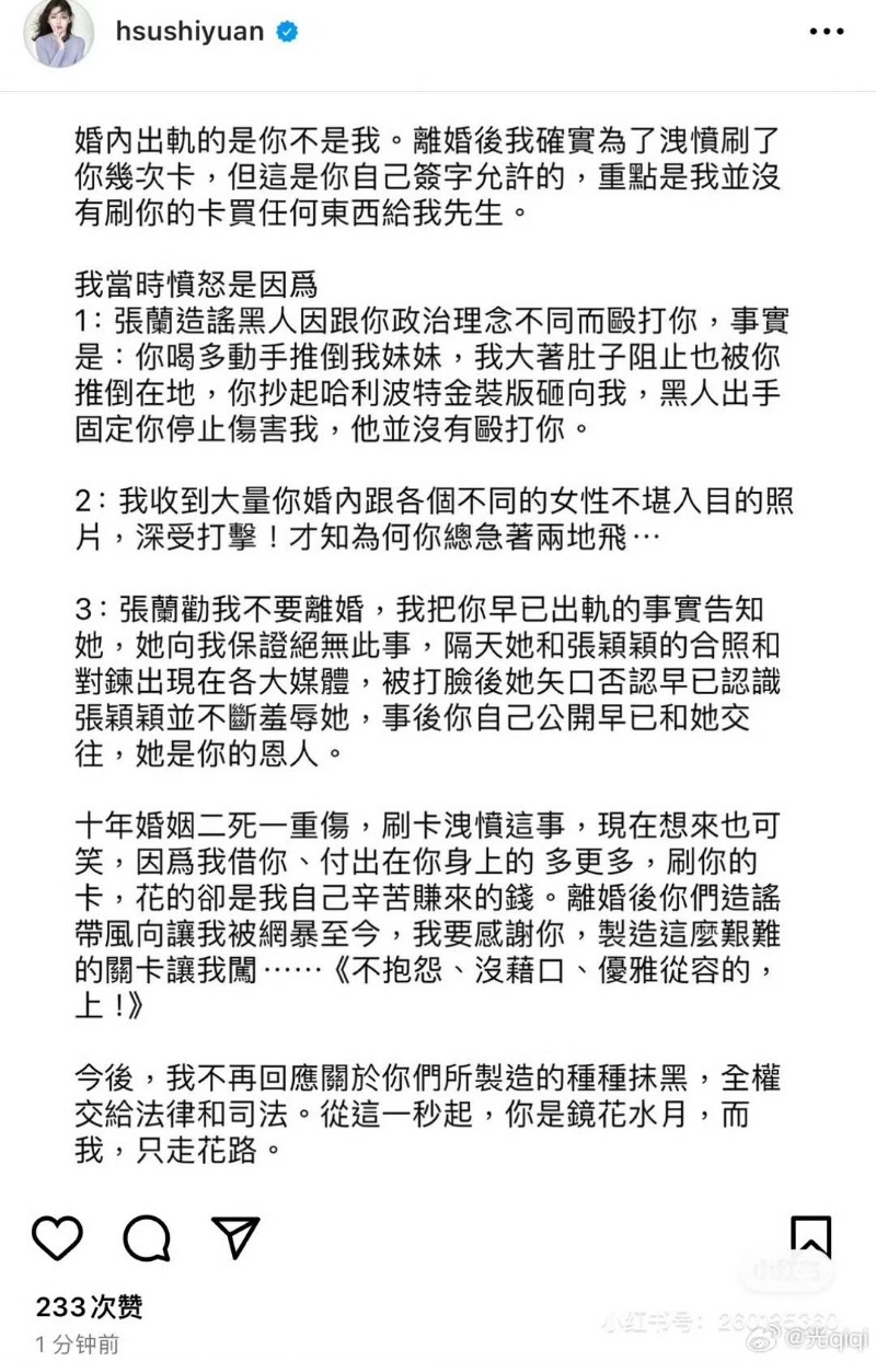 隨著被汪小菲爆料離婚前就買東西寄韓國,暗指她婚內出軌,大S發長文回懟,重點👇
