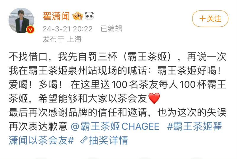 經過一天熱議之後,翟瀟聞21號晚間終於回應,表示…有錯就認,將會抽獎100個幸運兒,每人送100杯奶茶!!!以一杯20元(人民幣,下同)的價錢來算的話,這一波直接送出了20萬啊!
