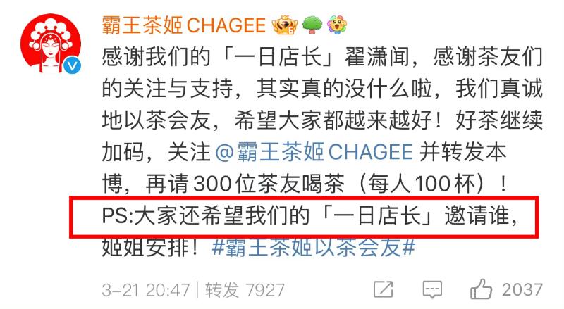 而品牌方也轉發了這則微博,還加碼送出300人,每人一百杯!看起來似乎事情過去了,不過最後一句話直接問:還想我們邀請誰當一日店長呢?這句出現在轉發翟瀟聞的道歉文裡,真的…有點尷尬了啊!