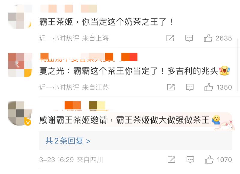 隨後,夏之光火速發文,表示霸王茶姬就是茶王,吧唧親一口,圓了自己的口誤!