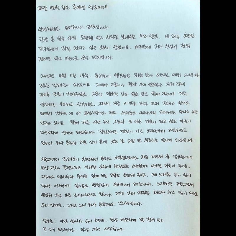 「大家好 我是Super Junior厲旭。有消息想直接告訴一直盡力支持我、給我愛的ELF和我最珍貴的朋友們。希望我能向大家傳達我的真心而寫的信。