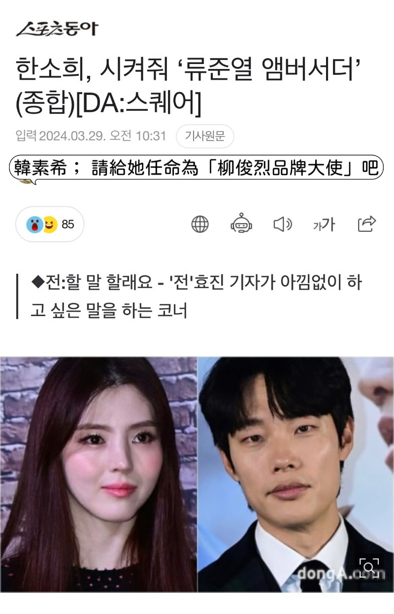 「韓素希:請給她任命為「柳俊烈品牌大使」吧!」