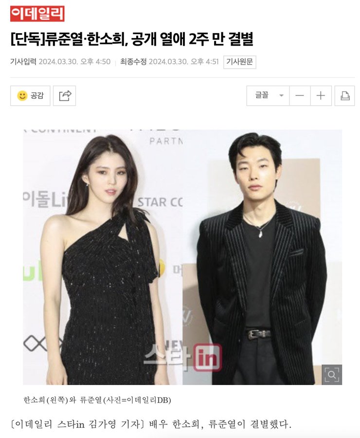 當時就有不少網友猜測,這表示和柳俊烈分了嗎?隨後,就有韓媒報導,表示在官宣戀情兩週之後,韓素希和柳俊烈正式分手!目前,柳俊烈公司已經承認了分手事實。