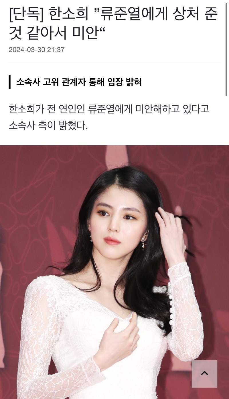 該相關人士表示:「韓素希對柳俊烈心懷歉意。特別是分手後留下的評論好像(對柳俊烈)造成了傷害,所以心情很沉重。她說沒想到自己行為的餘波會鬧得這麼大,並傳達了今後不會輕舉妄動的立場。」
