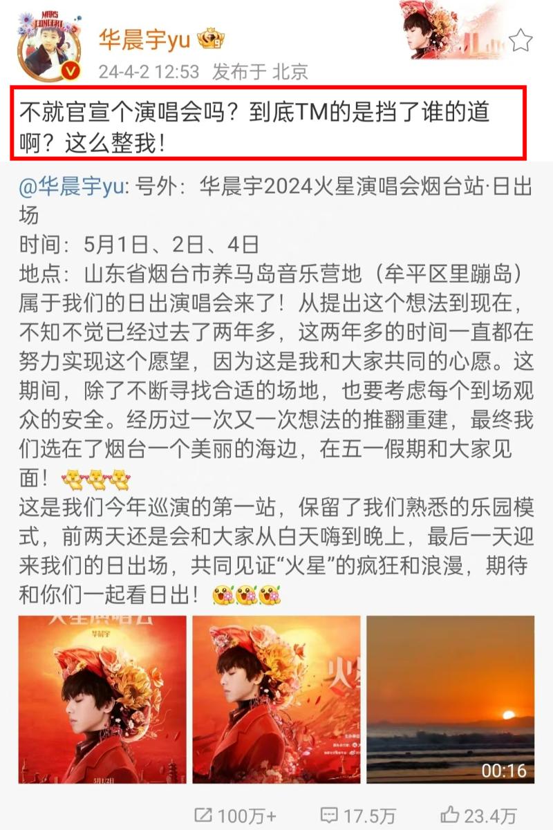 對此,華晨宇再次轉發自己的演唱會官宣文,爆粗直懟:「不就官宣個演唱會嗎?到底TM(他媽)的是擋了誰的道啊?這麼整我!」不過隨後刪除!
