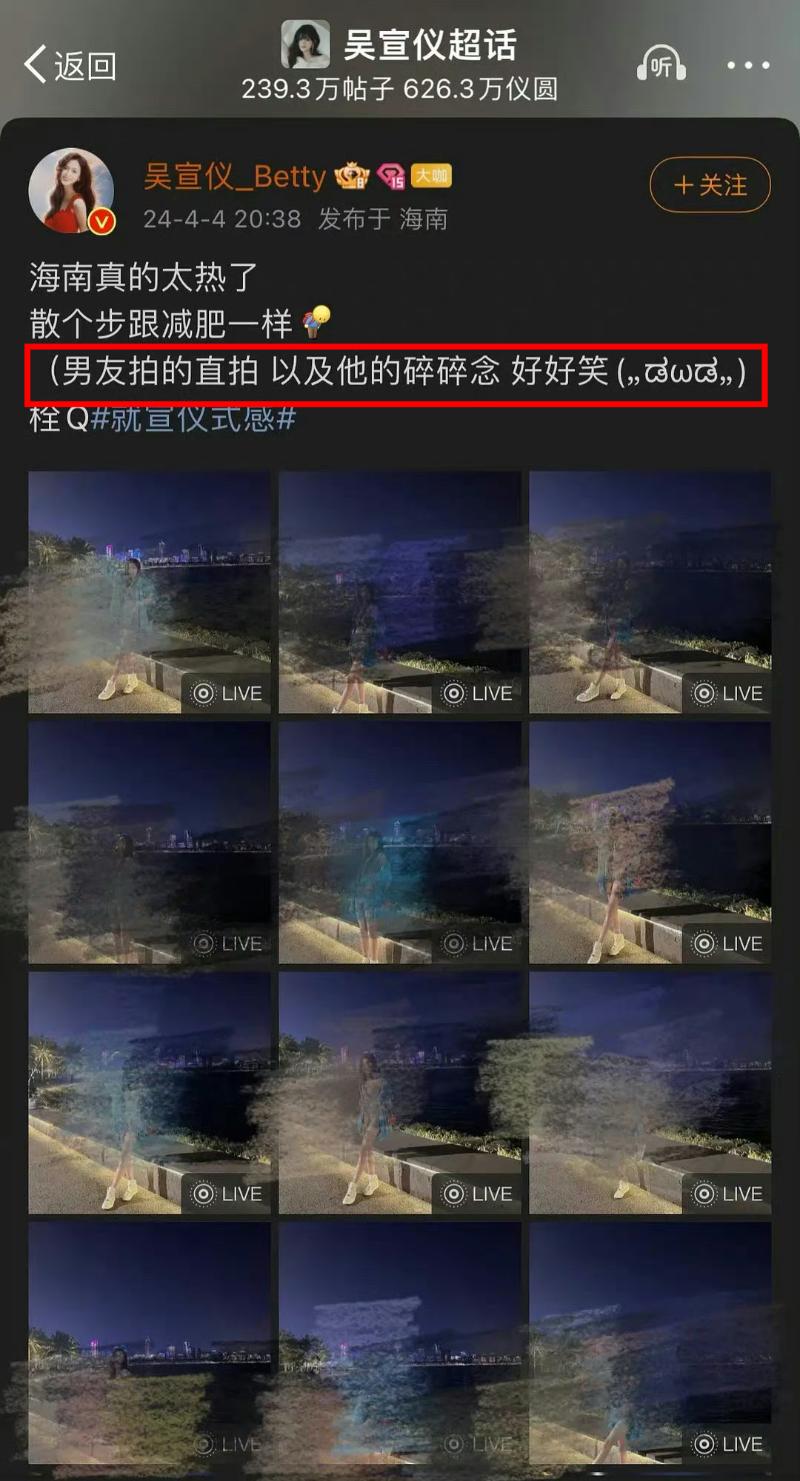 沒想到愚人節都過去了,吳宣儀繼續玩梗,只不過這次似乎玩出火了!是噠,最近回家鄉度假的吳宣儀,曬出了一組隨拍,備註是男友拍的直拍,說還有男友的碎念,好好笑👇