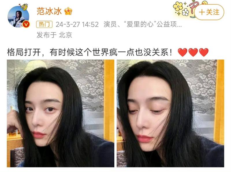 隨著熱議,范冰冰發文疑似回應,表示:「格局打開,有時候這個世界瘋一點也沒關係!」