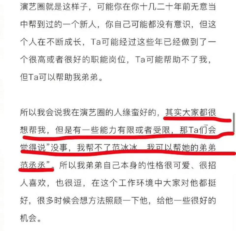 但沒想到近日范冰冰的一個訪問,卻引起了范丞丞粉絲的極度不滿。在該訪問中,范冰冰提到很多演藝圈內的朋友,由於能力有限或受限,就會轉向幫忙弟弟范丞丞👇