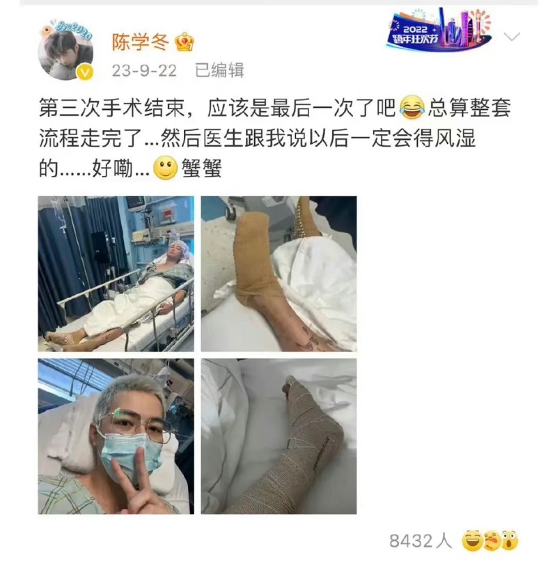 而在去年9月,他曾公開了自己在病床上的照片,表示8個月中動了三次手術,從車禍到現在「總算整套流程走完了」,應該不需要再進行手術。然而,醫生卻告訴他「以後一定會得風濕」,對此,他無奈地自嘲:「好嘞…蟹蟹(謝謝)​。​​」