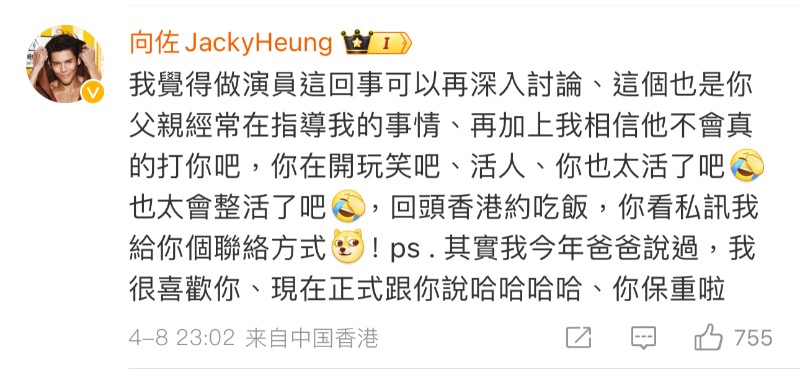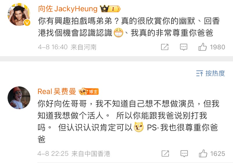沒想到這則評論,居然引來了當事人之一的向佐,空降評論區問費曼有沒有拍戲,還說自己很尊重吳鎮宇:「你有興趣拍戲嗎弟弟?真的很欣賞你的幽默、回香港找個機會認識認識、我真的非常尊重你爸爸。」