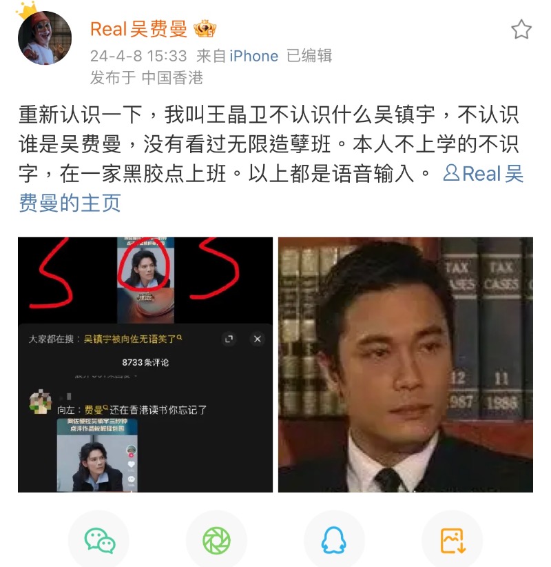 結果吳費曼直接發文回應否認自己身份:「我叫王晶衛不認識什麽吳鎮宇,不認識誰是吳費曼,沒有看過無限造孽班。」不認自家老爸之餘,還辣評《無限超越班2》實際上是“無限造孽班”,這小子果然是膽量在線啊!