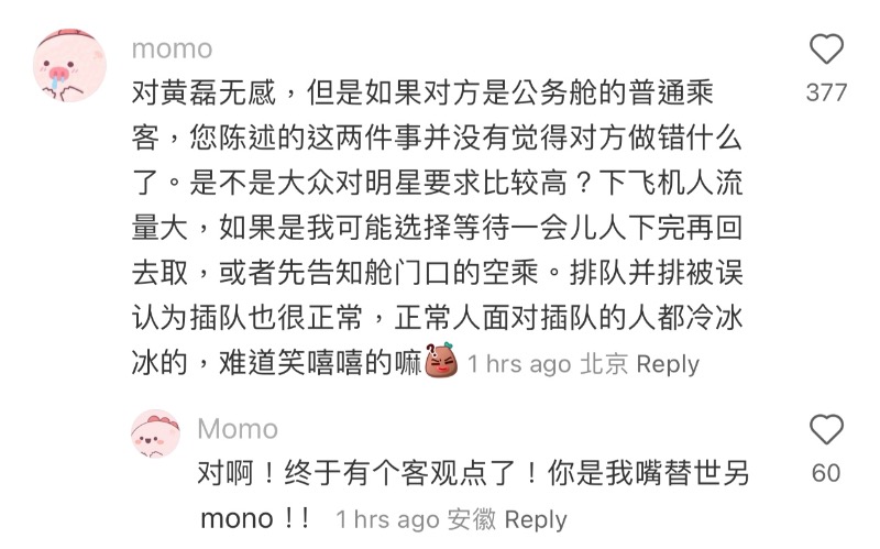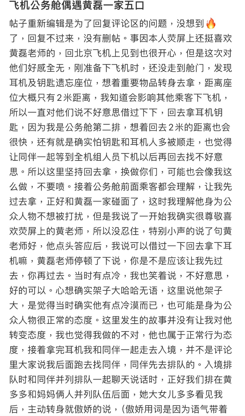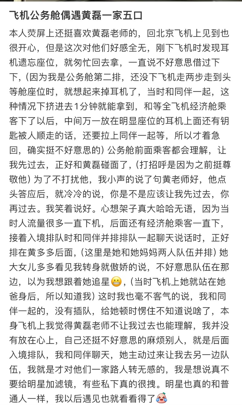 近日有網友發文,表示自己在商務艙偶遇黃磊、孫莉帶著三個孩子搭飛機,表示一番接觸下來,覺得黃磊和多多很mean很刻薄。到底怎麼一回事呢?省流版來說就是網友和黃磊一家都坐公務艙。下飛機後,網友想起耳機忘在飛機上,就立刻逆行回去取,當時黃磊要下飛機,由於很喜歡黃磊,所以打招呼喊黃老師你好,本想讓他借過的,但是黃磊態度特別傲慢的說:「是不是讓我過去了,你再過?」