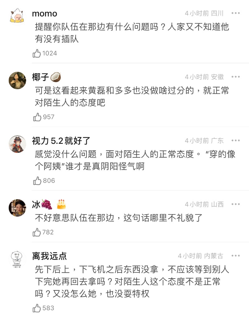 隨後在北京機場入境排隊時,網友和朋友並排站在多多和孫莉後面,當時網友和朋友聊天,黃多多對她說:「隊伍在那邊哦」,她認為黃多多把她當成追星族,用傲慢的語調對她頤指氣使。網友說,本來對黃磊一家蠻有好感的,這次見面並不愉快,發現黃磊一家人好拽,有高人一等的刻薄感。而網友的朋友沒認出黃多多,從外表打扮說還以為多多是黃磊家的阿姨(傭人)!