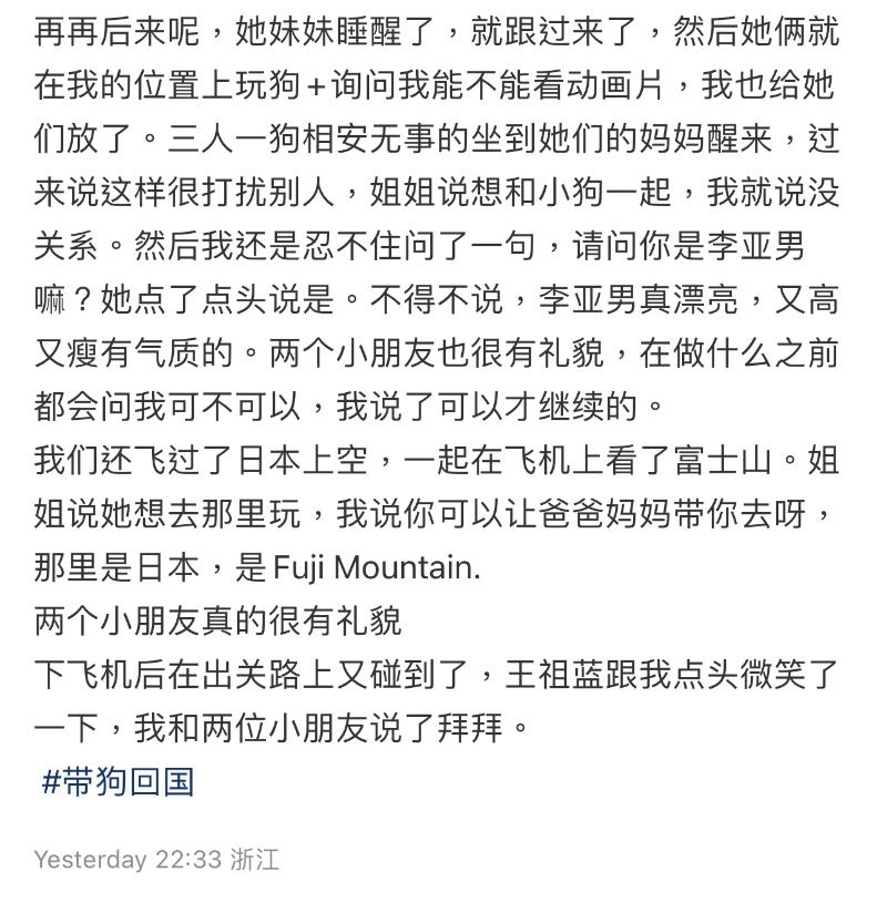 原Po表示自己在飛機上偶遇王祖藍一家,因為自己帶著小狗同行,因此吸引了王祖藍的兩個女兒,和自己玩了兩個小時。