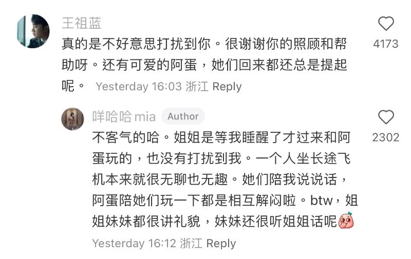 王祖藍也在評論區留言,再次對網友幫帶娃表示感謝,稱孩子回家還惦記小狗呢~而原Po也回應表示孩子是在自己睡醒時才過來和小狗玩,並沒有打擾到自己,和孩子們是相互解悶而已!