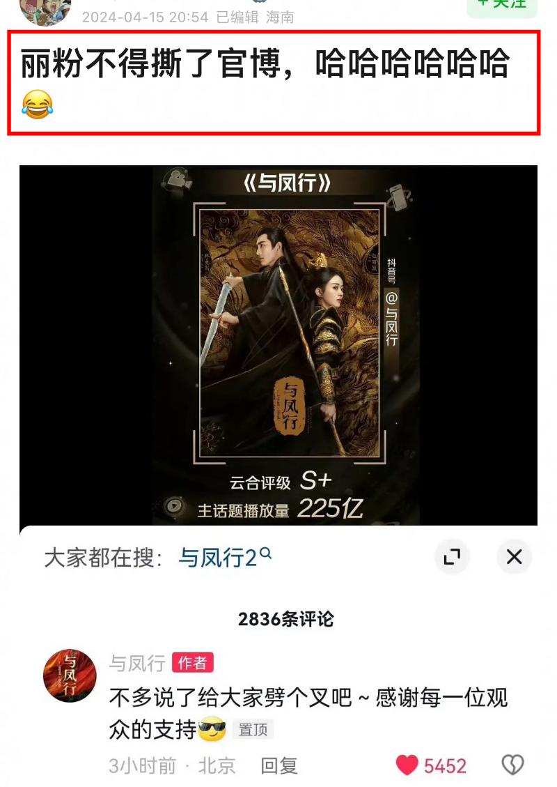 沒想到《與鳳行》官博還真的用了劈叉梗,被不少網友理解為在內涵趙麗穎👇