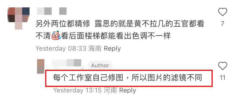 對於這幾張照片濾鏡不同,原Po再次回應,表示每家工作室審美不同,所以濾鏡也不同👇