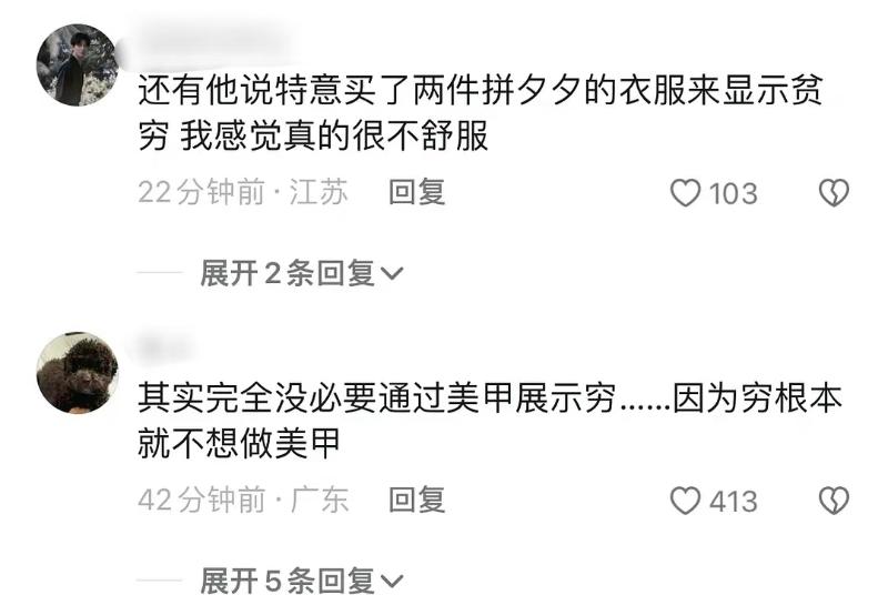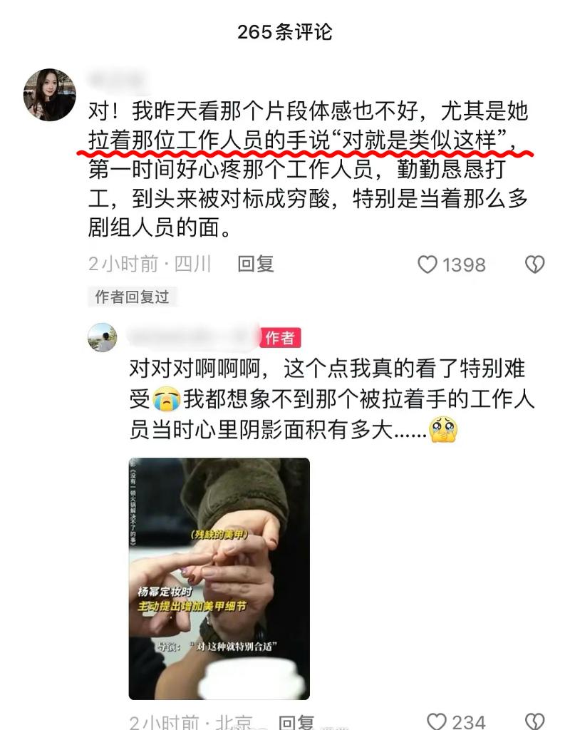 但這段花絮公開之後,就有網友楊冪拉著工作人員的手說:「對,就是類似這樣」的”窮酸美甲“,還當著現場這麼多工作人員的面,讓人體感很不好👇