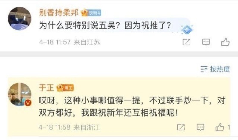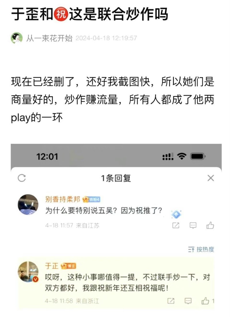 不過隨後于正就刪除這條回覆,但還是被手快的網友截圖,並發帖質疑兩人是不是真的聯合炒作?